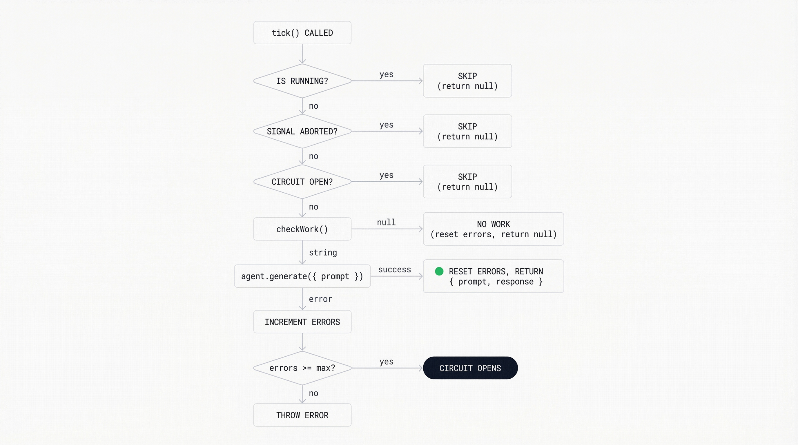For agents that need to run on a schedule (polling a queue, checking email, running maintenance), createHeartbeat wraps any agent with a concurrency guard and circuit breaker. You bring the scheduler (setInterval, Vercel Cron, whatever). The heartbeat handles the rest.