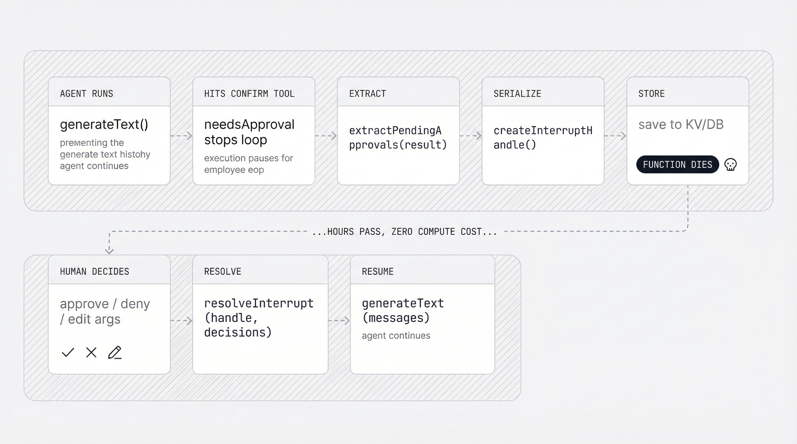 The agent pauses, serializes its entire state to a database, and dies. Zero compute cost while it waits. Six hours later, you check Slack, see "Agent wants to send this email," click Approve, and the agent resumes exactly where it left off, with your approved (or edited) arguments.